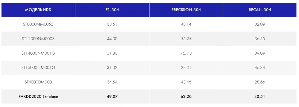 We managed to build a prototype model that does not depend on the execution time and the specific instance of the disks. Our test sample included disk instances with serial numbers that were not in the training, but this practically did not affect the quality of the prediction. Therefore, we believe that we have obtained a fairly universal model - there is no critical dependence on the SMART disk data used in a particular company. This means that our model does not require a complex system for the regular collection of SMART data and disk failure events. This is its main value.