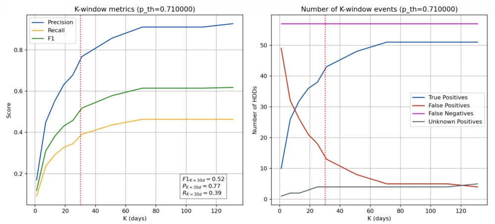 Precision — is the accuracy, the proportion of true positive predictions among all positive predictions of the model. In our case, the prediction is considered to be the answer to the question of whether a particular disk will fail in the near future or not. Thus, a Precision of 0.7 would mean the following: if the model predicted the failure of 100 disks, then in reality only 70 of them will actually fail in the near future.