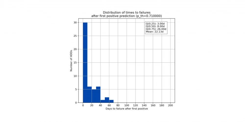 This histogram is the so-called survival time histogram. It shows the distribution of time between the first positive prediction of the model and the actual failure of the disk. Again, specifically for the selected hard drive model.