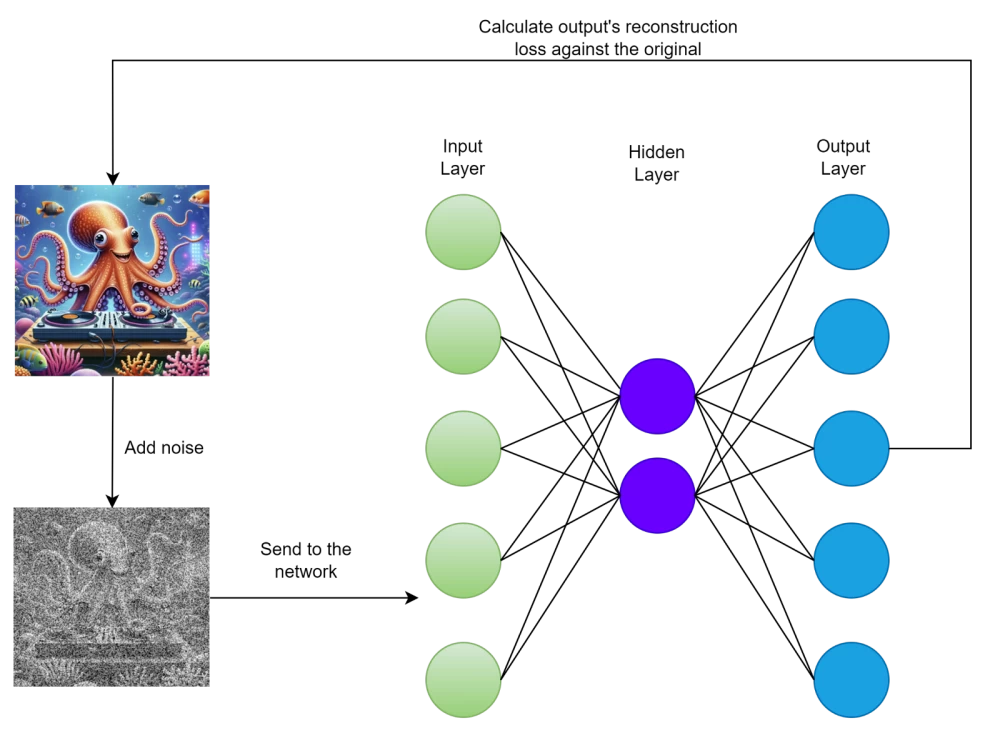 Another idea is to add noise to the original image and use it as input, but for error calculation, compare it with the cleaned original. Thus, the model learns to remove noise from the image, but as a side effect, it can no longer simply memorize the input data because the input and output do not match. Here is what the training process looks like: