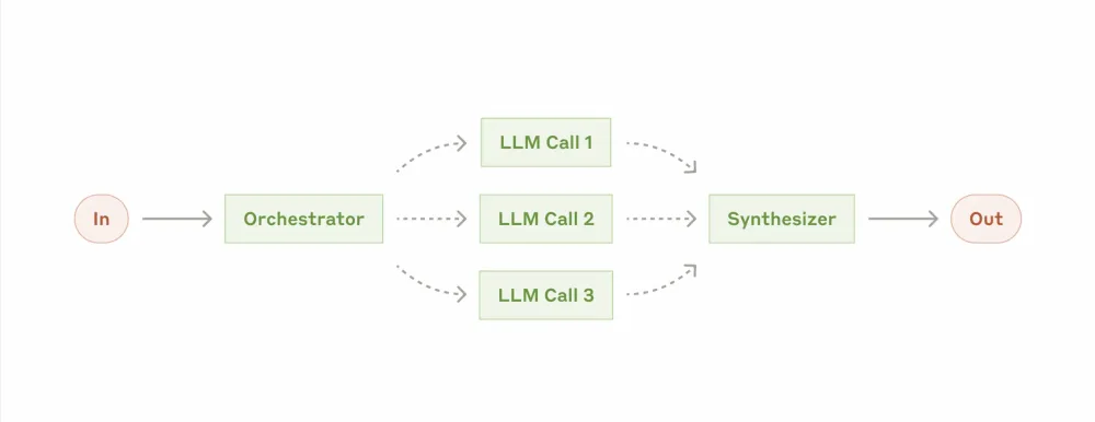 When to use orchestration: although topographically it resembles parallelization, the key difference lies in its flexibility — subtasks are not predefined but determined by the orchestrator based on the specific input request. Therefore, it is well-suited for complex tasks where it is impossible to predict the necessary subtasks in all cases.