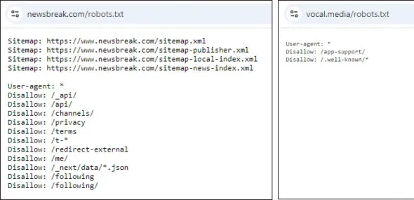 It would be remiss not to tell you about another way to block bots, which is in a file called .htaccess. This file is not publicly viewable. Therefore, I cannot say for sure whether Newsbreak and Vocal provide open access to AI bots. I only know that they do not block them in their robots.txt file.