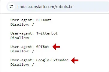As you can see, my Substack tells ChatGPT and Google's AI, such as Bard and Vertex AI, that they are prohibited from training on my texts in Substack.