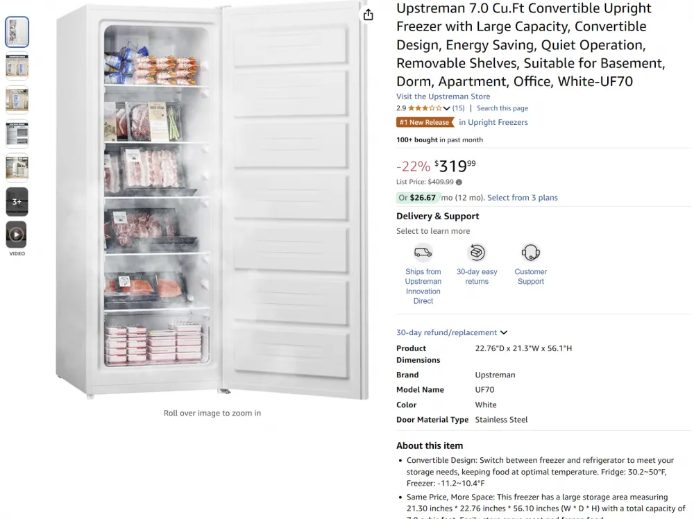 Model: Upstreman UF70 Capacity: 7.0 cubic feet Energy Efficiency: ENERGY STAR certified Dimensions: 56.1x21.3x22.8 inches (H x W x D) Color: Pearl White | Model: Upstreman UF70 Capacity: 6.9 cubic feet Energy Efficiency: ENERGY STAR certified Dimensions: 56x21.2x22.9 inches (H x W x D) Color: White |
