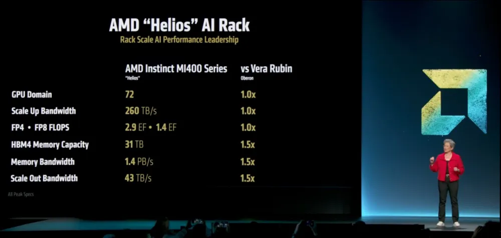 The flagship MI400x will arrive in 2026. This is 40 petaflops, 432 GB HBM4, bandwidth of 19.6 TB/s. Release in 2026. For data centers, the Helios AI-Rack will be available: 72 MI400x inside, 2.9 exaflops, 1.4 PB/s bandwidth, and 31 TB VRAM. This is a direct competitor to Nvidia’s NVL144, but with an open architecture instead of Nvidia’s NVLink.