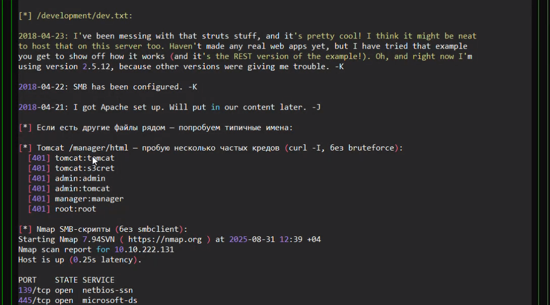 Checked Tomcat /manager/html (responded 401), and also gathered information on SMB without smbclient. At this stage, it highlighted two important hints: first, SMB is indeed configured and provides an opportunity for attack, and second, Struts 2.5.12 is mentioned, with Tomcat running on port 8080.
