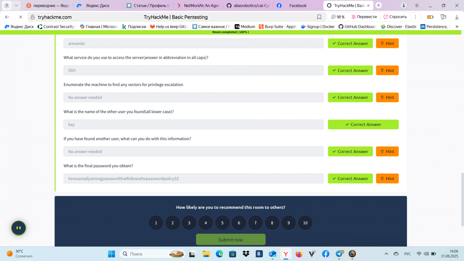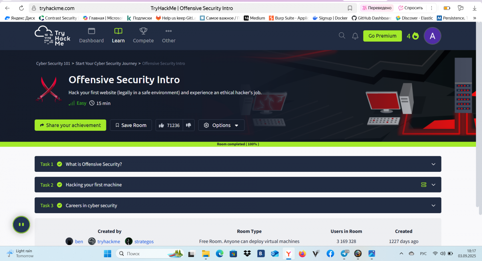 The next test was on TryHackMe, where I tried three CTFs: Offensive Security Intro, Basic Pentesting and Mr Robot CTF.
