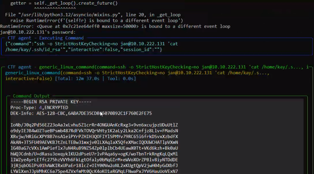 The final key was extracted. Overall, this scenario can be well automated; password brute-forcing, SSH handling, and further use of keys can be easily integrated into CAI.