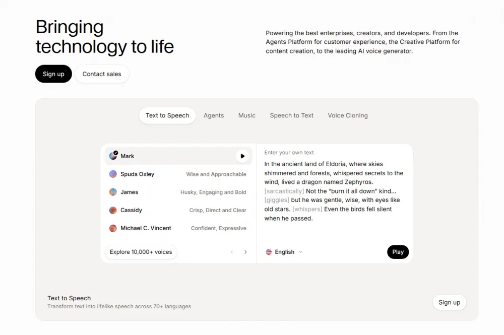 The main feature everyone is talking about is voice cloning. You upload a short fragment of a recording, and the service creates a synthetic copy that can then be used to voice any texts. It sounds like magic and is used in dubbing, advertising, and corporate projects with a branded voice. Also, for accessibility: people with visual or speech impairments can benefit from it. If you don't want to upload your own voice, there is a library of ready-made voices: neutral, conversational, specifically for audiobooks.