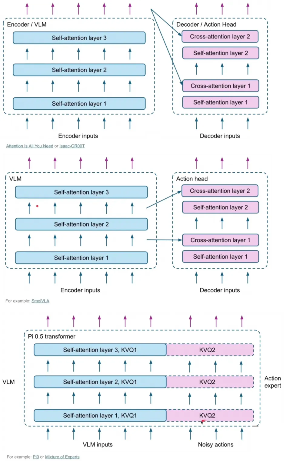 then a separate, relatively small model transforms these embeddings into a sequence of actions for the robot. In a typical VLM, there is a large decoder to text.