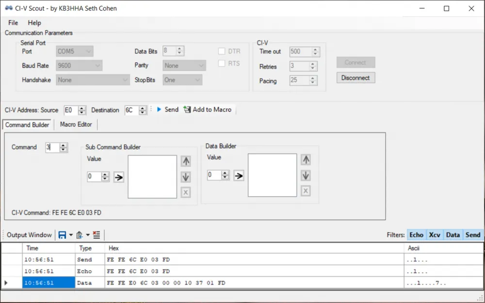 Ten minutes later, I had the assembled cable in front of me, and I immediately decided to test it using the CI-V Scout application, created by radio amateur KB3HHA Seth D Cohen. This small program allows you to form and send a set of bytes to a CI-V supported device, in response to which it should react and return information.