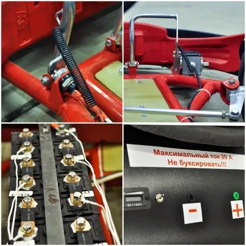 To solve this problem, the kart uses a BMS (battery management system), which monitors the voltage on each of the 16 batteries. As soon as the voltage reaches the maximum on the batteries closer to the positive terminal, it conditionally shorts them to resistance. That is, charging continues, but the overcharged batteries no longer participate, preventing them from overcharging. Gradually, more and more of such batteries are involved, and by the end, only the batteries near the negative terminal charge. When the total charge becomes maximum, the system breaks the circuit and charging stops.