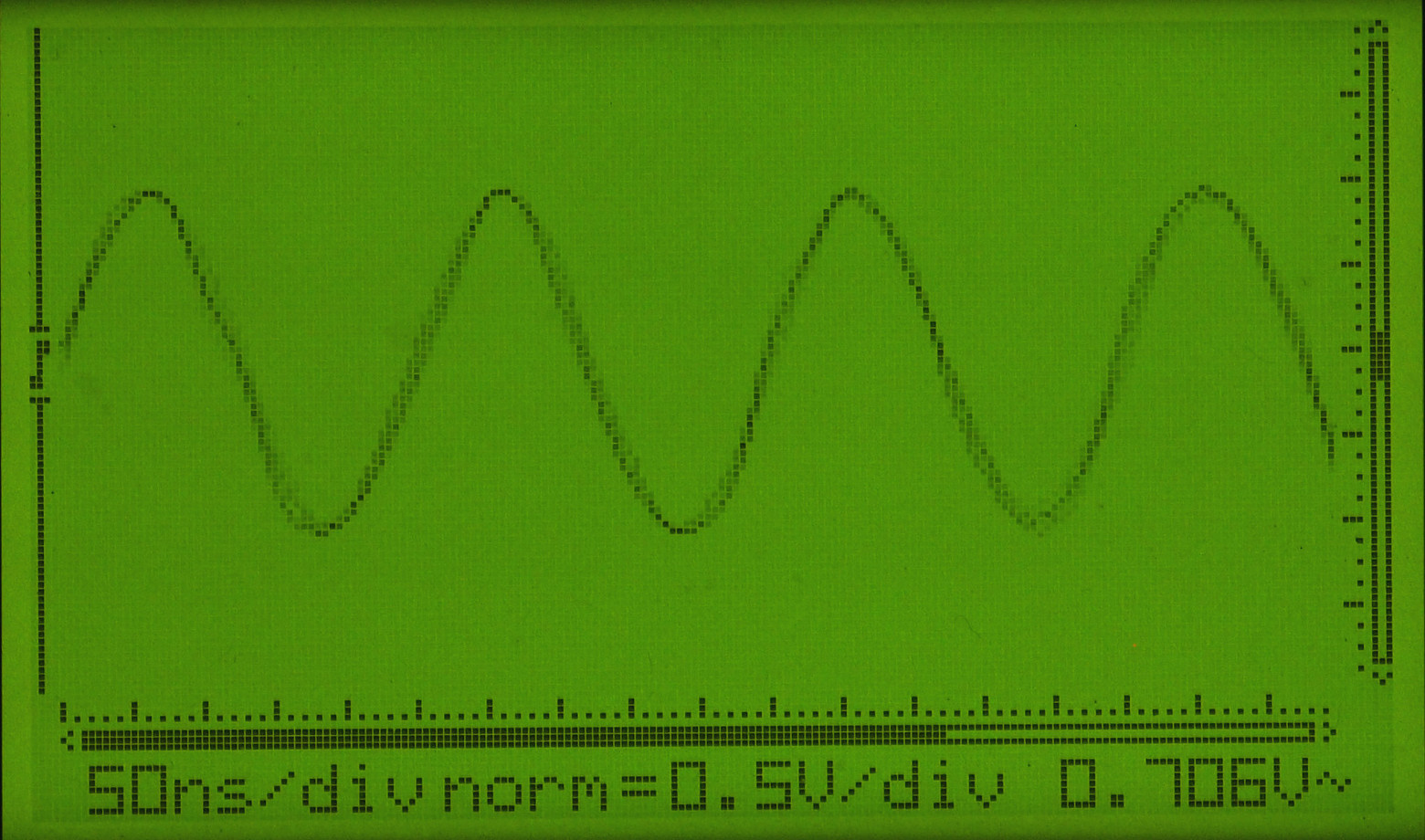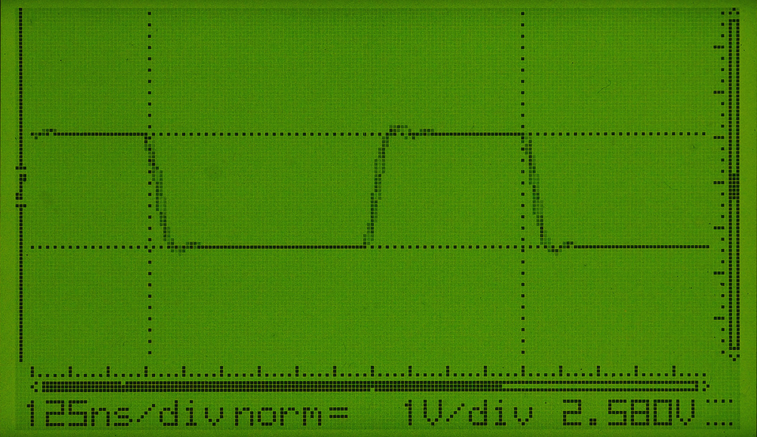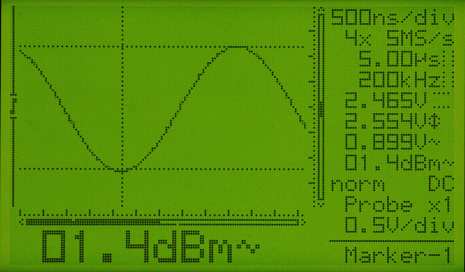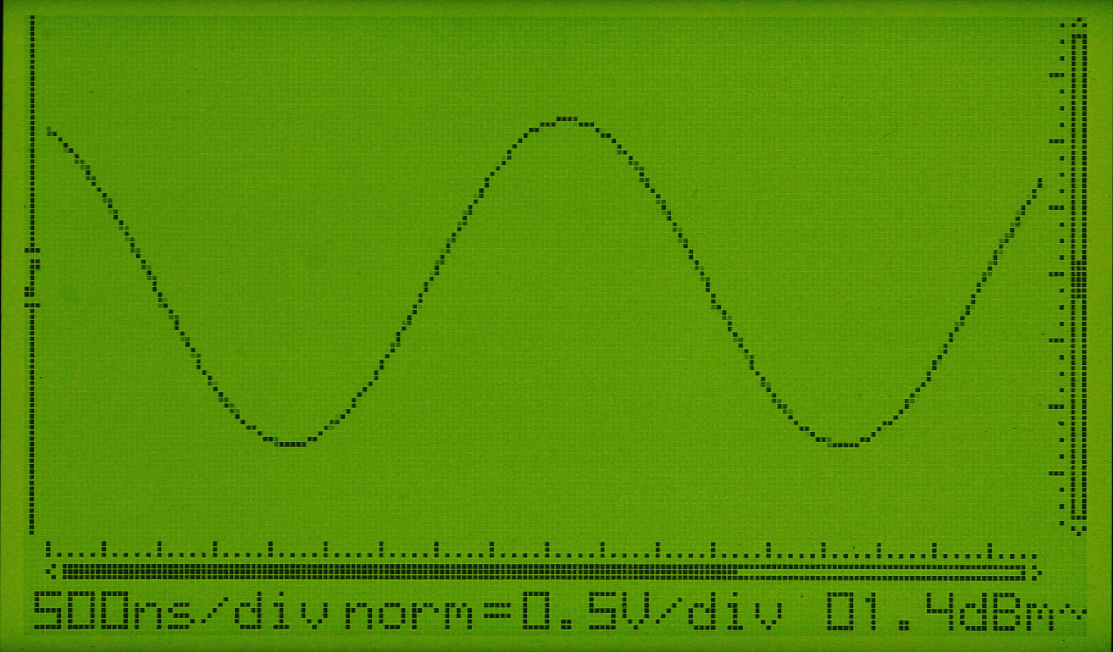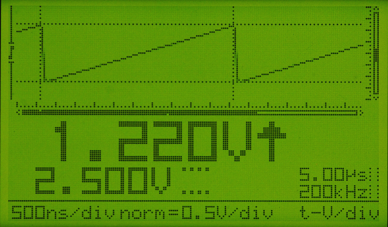 The device has a monochrome LCD screen, 112×192 pixels, with a green LED backlight. The backlight color is softer than in photos. The waveform refresh rate is acceptable, I expected worse. I noticed that it increases if the mode is used where the screen space is split in half with the “Measurements” field.
