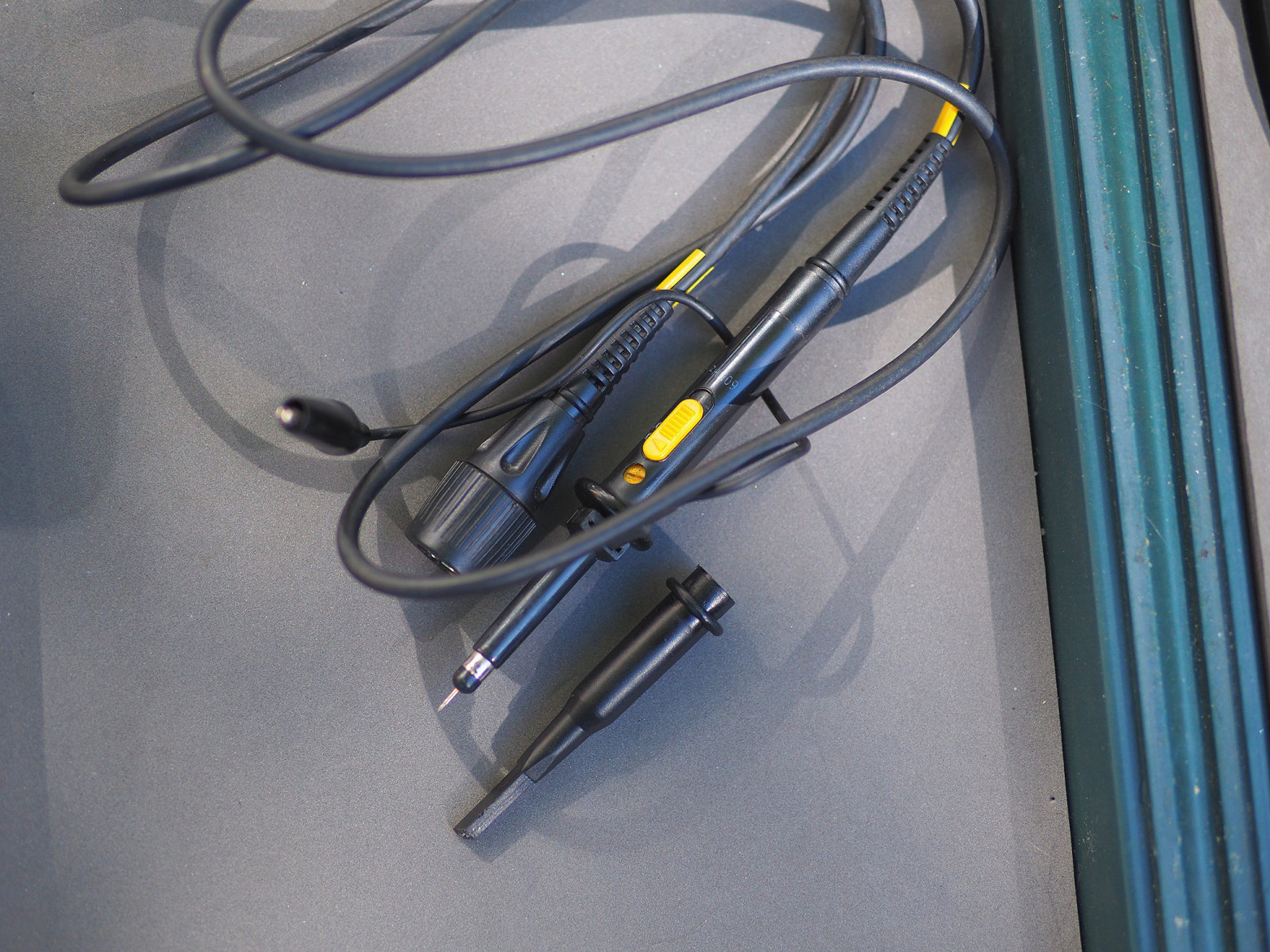 The oscilloscope is single-channel, and the probe included in the kit is made well. The signal cable is a bit thick, but it’s soft and does not strain the hand during use. The probe handle features a switch for a 10x divider and an adjustment capacitor for compensation.