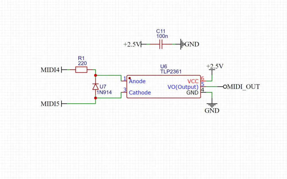 I took 5 volts from USB type-c, so the output signal had to be matched to, in my case, 2.5 volts. The minimum supply voltage for the 6N138 is 4.5 volts; it obviously wouldn't start from 2.5 volts from the PSP. Therefore, I devised a second option using the fast optocoupler TLP2361, which according to the datasheet requires a minimum of 2.7 volts, and 2.5 volts from the PSP turned out to be sufficient for operation. When powered from 2.5 volts, no level matching was necessary.