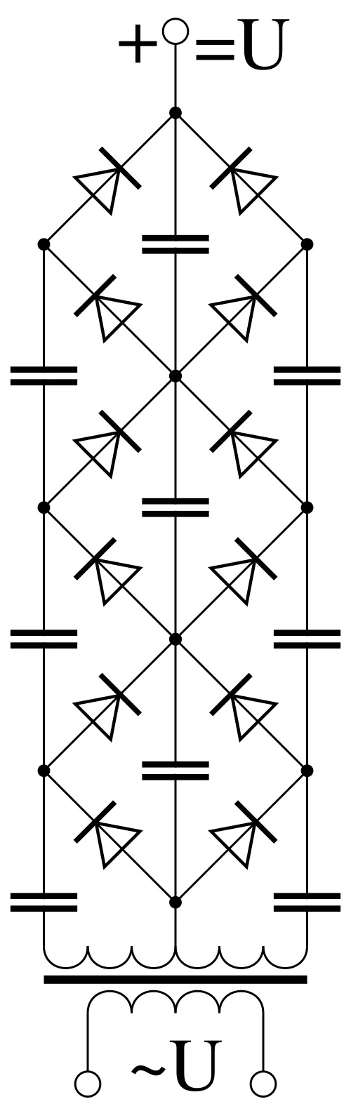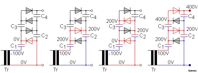 The working voltage that can be achieved with this circuit is arbitrary, within certain limits*, and depends only on the number of "stages," which refers to an assembly of two capacitors and two diodes—we saw this clearly in the picture above, with the principle of operation, where essentially, we could limit ourselves to just the first block of four components, at the output of which a doubling to 200 V occurred—that block is the necessary minimum stage.
