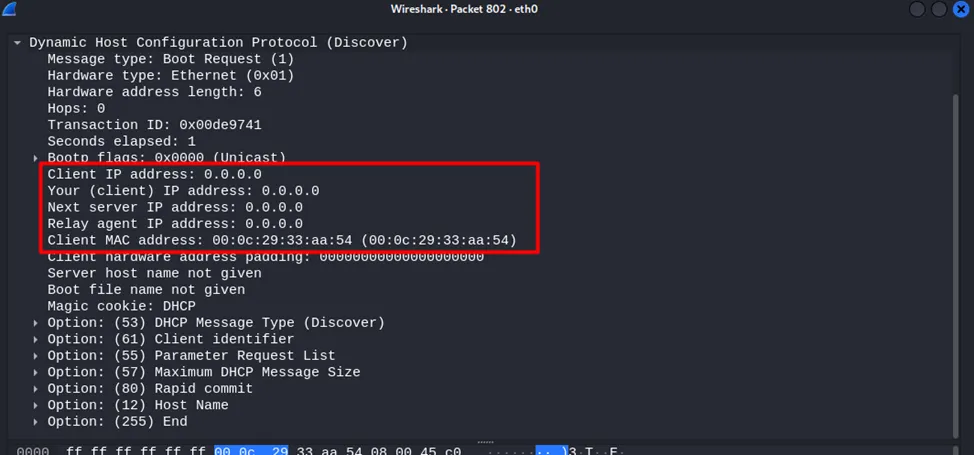 Let's see what each of these steps looks like in a traffic dump. In the first step, the client does not have an IP address, so the source address is 0.0.0.0, and the recipient address is all nodes on the network — 255.255.255.255. At the data link layer, the client has its MAC address, and the sender address is ff:ff:ff:ff:ff:ff.