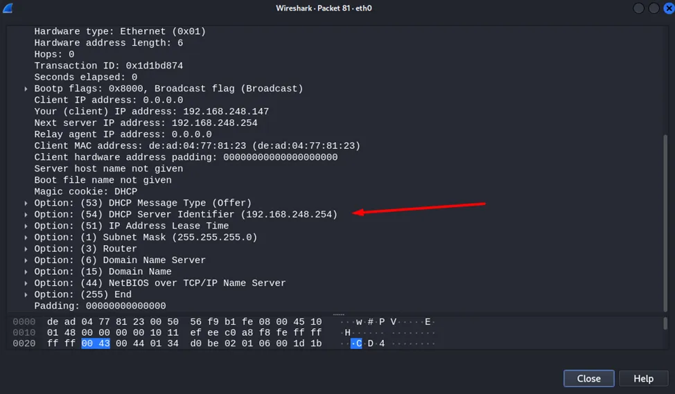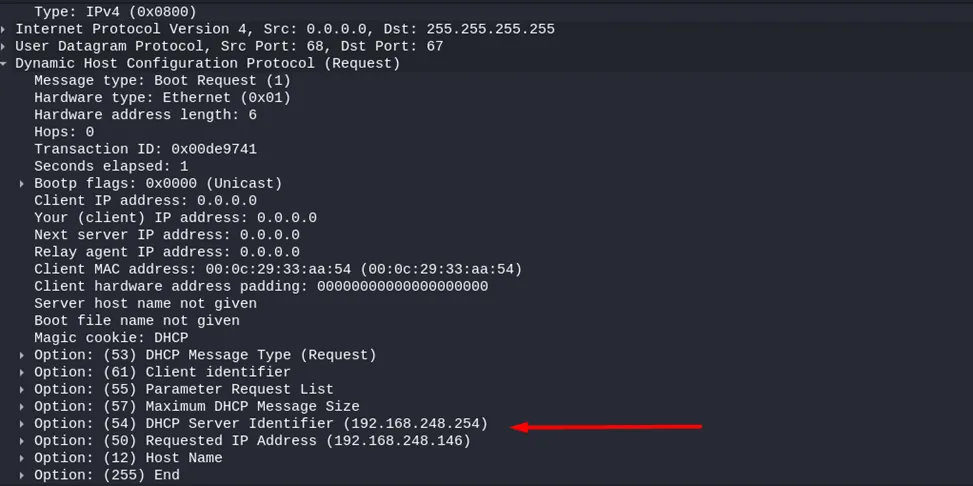 To do this, you need to know the IP addresses of our legitimate servers that issue IP addresses. Accordingly, the appearance of Offer, Request, and Ack packets containing in the Option 54 DHCP Server Identifier field IP addresses different from our legitimate servers is a sure sign of an attack.