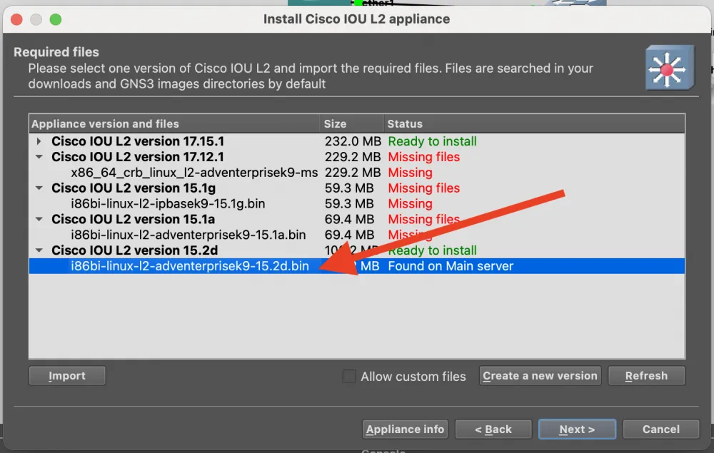 But there will be no Download button here, and you will not be able to download the image. Look for the image i86bi-linux-l2-adventerprisek9-15.2d.bin on the Internet. Don't worry about downloading a file from an unofficial site - when importing, GNS3 will check the checksum and warn you if something is wrong.