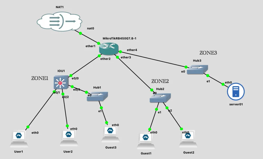 ether4 = LAN3 (servers)Let's assume that in the 2nd building there is no longer enough space for guests. And in the first building, there is free open space and a lot of free area. As a result of discussions among the enterprise leaders, it was decided to organize guest access in this open space.