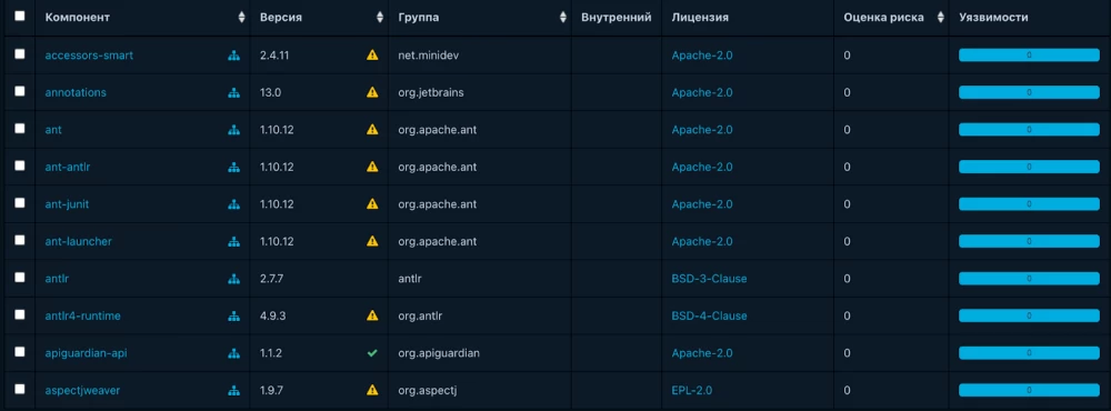 In addition to vulnerability analysis, the use of Dependency-Track provided an additional advantage — the ability to automatically analyze the licenses of the libraries and components used. This aspect is also important for our projects, as it allows us to monitor license compliance with internal requirements and reduce the risk of intellectual property violations.