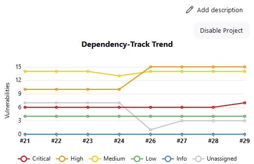 Pilot implementation of Dependency-Track has shown that the use of vulnerable dependencies is a common problem faced by almost all projects, especially in the context of active use of open-source libraries. Without specialized tools like Dependency-Track, developers often do not realize the existence of this problem, and vulnerabilities can go unnoticed throughout the entire product lifecycle.