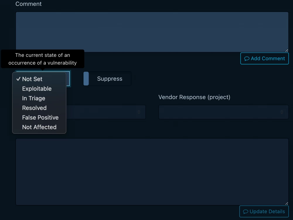 Managing the vulnerability list through the UI. The Dependency-Track interface allows you to manually manage vulnerability lists, adjust them, add or exclude items at your discretion. This gives the team the ability to flexibly respond to changing conditions and keep the data up to date.