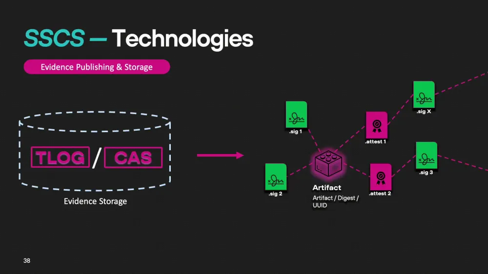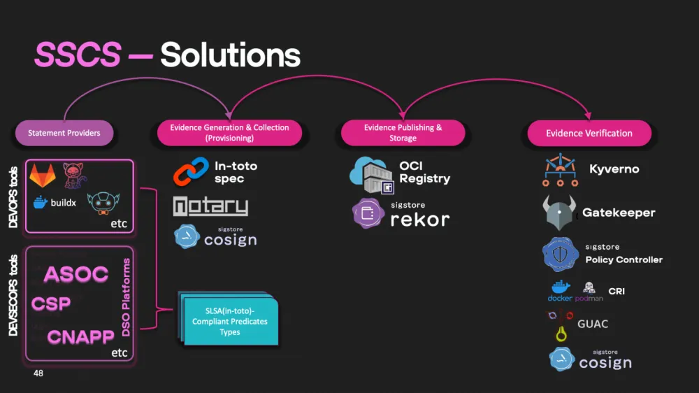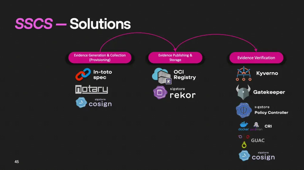 As we mentioned earlier, the software supply chain (SSCS) includes three key stages: generation, storage, and validation of evidence. Let's consider what technologies and solutions can be used at each of these stages.