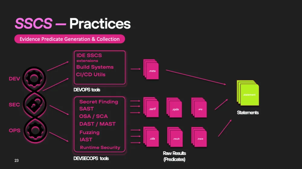 Today, this process can be simplified to two key elements: signature and attestation. Within the in-toto framework, attestation can include any statement collected during the development process. For example, various DevOps and DevSecOps tools (such as CI/CD, secret scanning systems, DAST, SAST, etc.) can generate reports, and these reports can be included in the attestation as evidence.