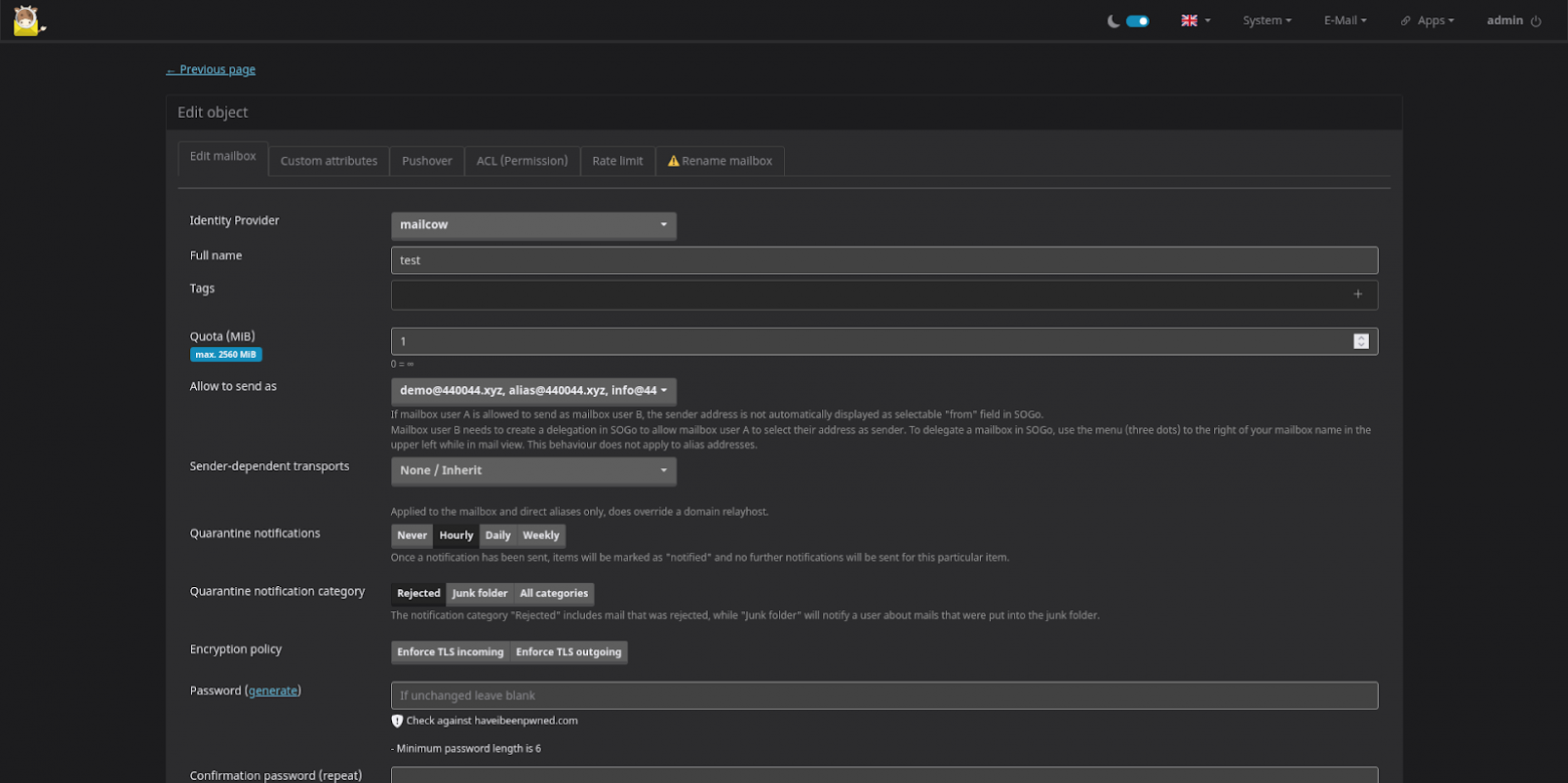 Step 2. Create a test mailbox in Email → Configuration → Mailboxes and set a low quota value (e.g., 1 MB) to make testing easier.