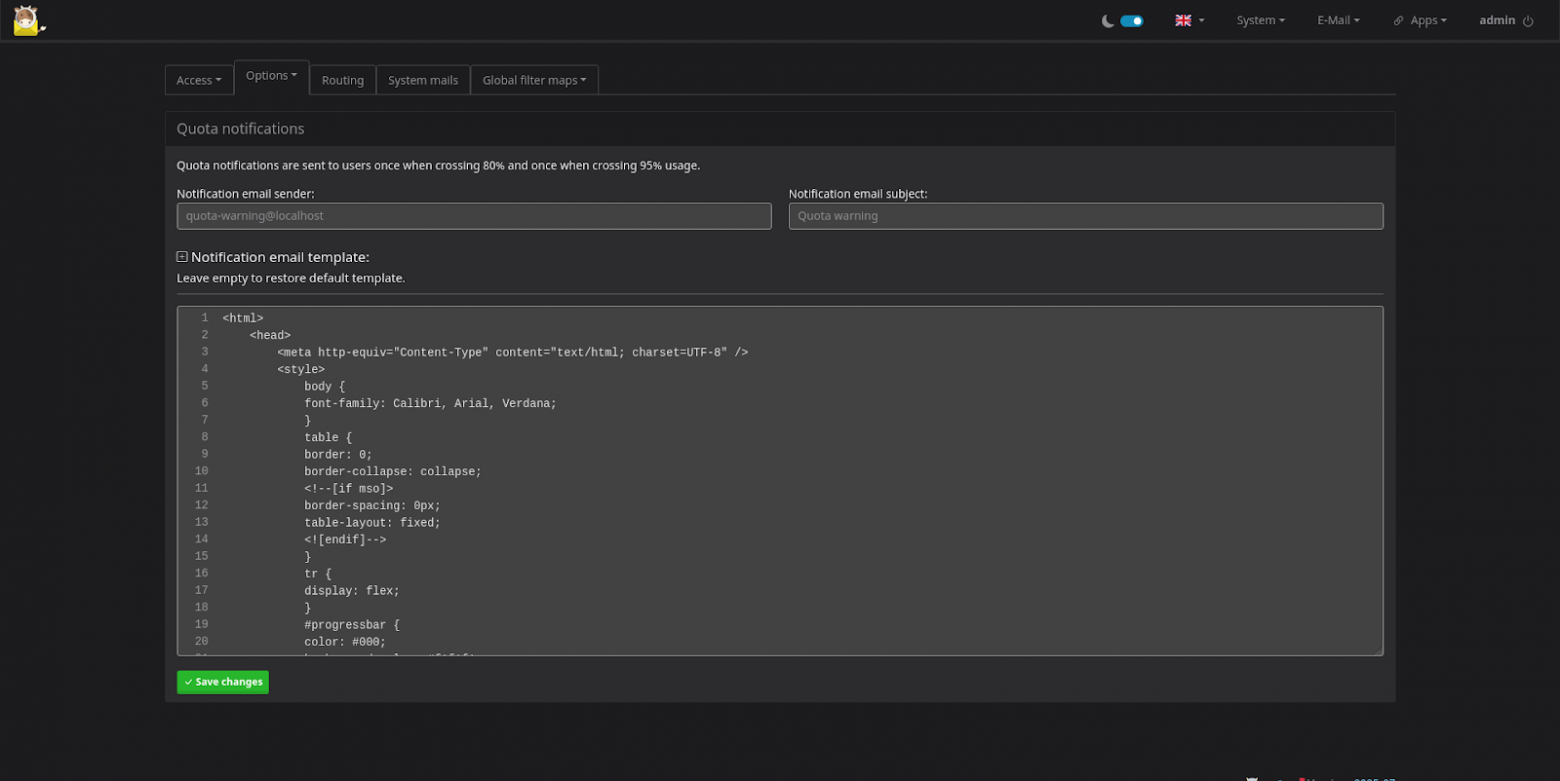 Step 1. Log in as an administrator and configure a custom quota overflow notification template under System → Configuration → Options → Quota notifications.