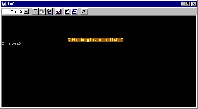 The compiler consists of several executable files, in particular, RPGC.EXE (the compiler) and SEU.EXE (the source editor, Source Entry Utility). Here’s what we get a few seconds after launching SEU without the dongle: