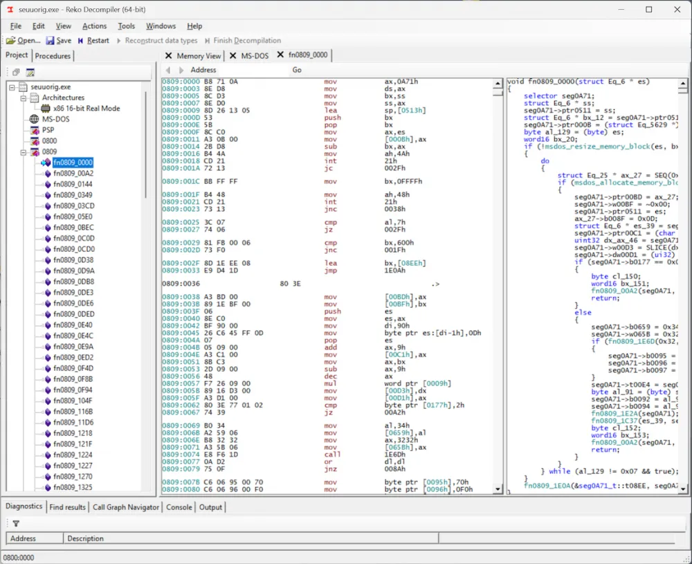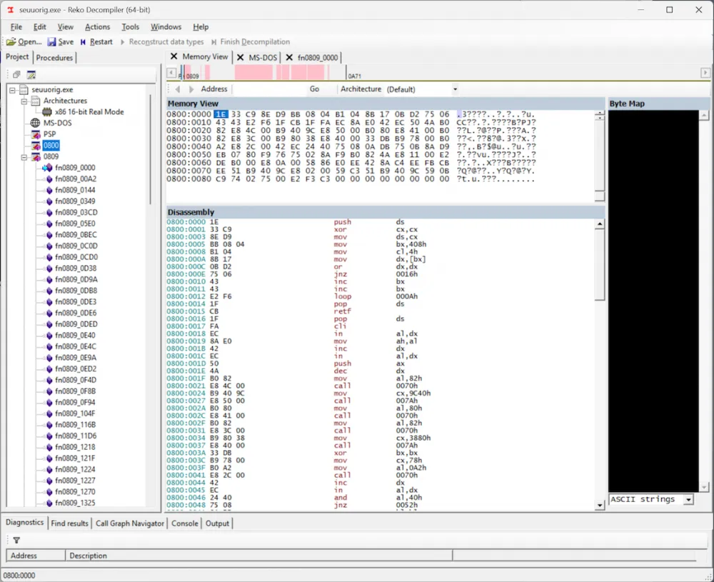 While studying the decompiled/disassembled code in Reko, I expected to find the in and out commands, which would indicate that the program is trying to communicate with the parallel port through the PC's input-output ports. However… I couldn't find these commands anywhere! But then I noticed something: Reko disassembled the executable file into two "segments": 0800 and 0809, and I was only examining the 0809 segment.